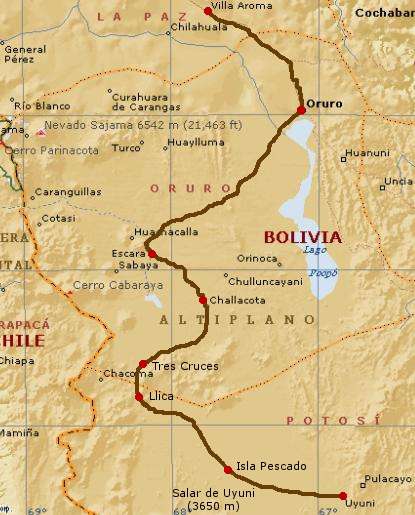 Maurizio è arrivato a La Paz ieri (21 agosto). Dopo aver superato il Salar de Uyuni e il Salar de Coipasa è arrivato a Pisiga vicino al confine cileno (vedi Mappa 2). Qui ha deciso di prendere un autobus, probabilmente per guadagnare del tempo sulla sua tabella di marcia rallentata dalla prima parte del percorso e puntare su La Paz da dove riprenderà in bicicletta verso il lago Titicaca fino ad arrivare ai margini della giungla.